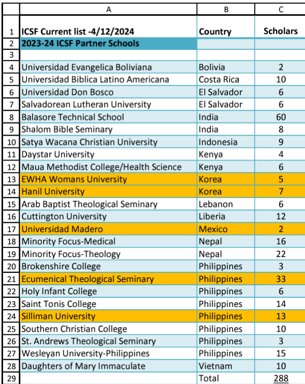 ICSF currently works in 28 schools in 15 countries funding 244 scholars.